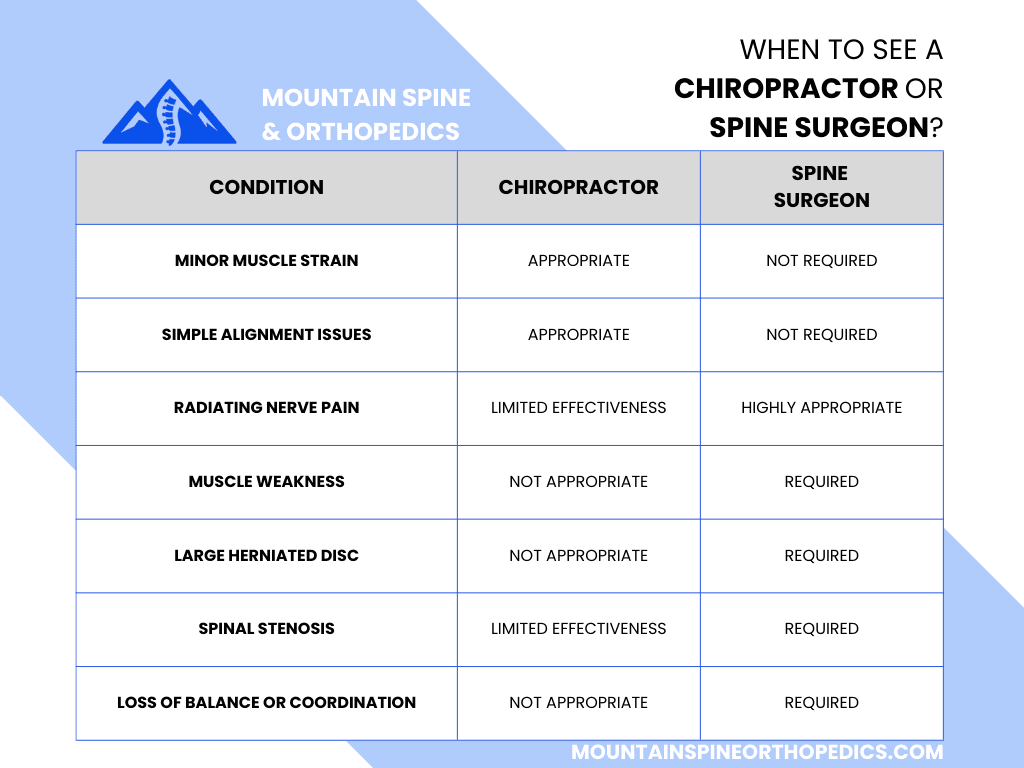 You should see a spine surgeon if your pain is chronic, worsening, or causing numbness, tingling, weakness, or radiating pain. Surgeons evaluate structural problems that chiropractors cannot treat, such as large herniated discs or spinal stenosis.